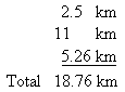 The distance of 11 km contains no significant figures to the right of the decimal point. Therefore, neither does the sum of the three distances, and the total distance should not be reported as 18.76 km. Instead, the answer is rounded off to 19 km. In general, when numbers are added or subtracted, the last significant figure in the answer occurs in the last column (counting from left to right) containing a number that results from a combination of digits that are all significant. In the answer of 18.76 km, the eight is the sum of 2