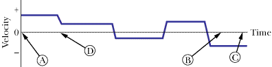Letters point to six points on the velocity curve. For the physical situations described below, identify which of the letters corresponds to the situation described. You may use each letter more than once, more than one letter may be used for each answer, or none may be appropriate. If none is appropriate, use the letter N.