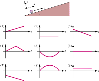 For each of the following quantities, select the letter of the graph that could provide a correct graph of the quantity for the ball in the situation shown (if the vertical axis were assigned the proper units). Use the x and y coordinates shown in the picture. If none of the graphs could work, write N.