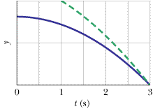 Rock Climber At time t = 0, a rock climber accidentally allows a piton to fall freely from a high point on the rock wall to the valley below him. Then, after a short delay, his climbing partner, who is 10 m higher on the wall, throws a piton downward. The positions y of the pitons versus t during the fall are given in Fig.