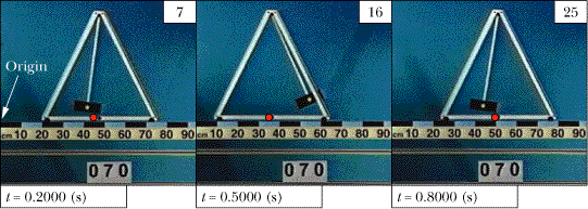 A Strange Motion After doing a number of the exercises with carts and fans on ramps, it is easy to draw the conclusion that everything that moves is moving at either a constant velocity or a constant acceleration. Let's examine the horizontal motion of a triangular frame with a pendulum at its center that has been given a push. It undergoes an unusual motion. You should determine whether or not it is moving at either a constant velocity or constant acceleration. (Note: You may want to look at the motion of the triangular frame by viewing the digital movie entitled PASCO070. This movie is included on the VideoPoint compact disk. If you are not using VideoPoint, your instructor may make the movie available to you some other way.)