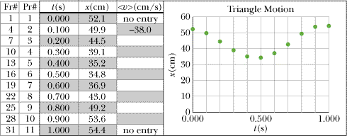 Data for the position of the center of the horizontal bar of the triangle were taken every tenth of a second during its first second of motion. The origin was placed at the zero centimeter mark of a fixed meter stick.These data are in the table below.