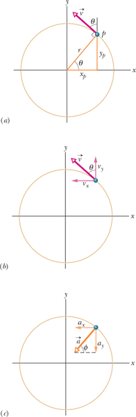 |  | |  | | FIGURE 4-20 | Particle p moves in counterclockwise uniform circular motion. (a) Its position and velocity at a certain instant. (b) Velocity . (c) Acceleration .