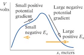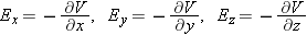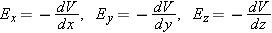 The meaning of ∂V/∂x is simply “take the derivative of V with respect to x while holding y and z constant.” The fact that Ex = −∂V/∂x is closely related to the fact that (as we saw in Chapter 6 on energy) Fx = −∂U/∂x, because E = F/q and V = U/q.