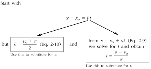 Compare Equation 2-11 with x − xo = vt, which is valid whenever v is constant. If v does not change from its initial value vo, then a, its rate of change, is zero, and Equation 2-11 reduces to x − xo = vot. Otherwise, the last term on the right-hand side of Equation 2-11 represents an additional contribution to the position. This contribution is needed because the velocity is changing.