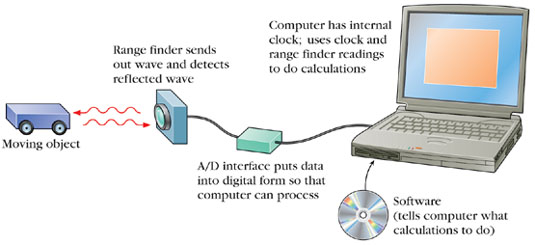 Range Finder Measurements One way of doing the necessary measurements is with a sonic range finder (or motion detector) connected to a computer (Figure 2-16). Software loaded into the computer enables it to do calculations and plot graphs using the input from the range finder.