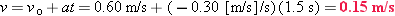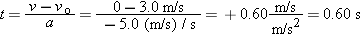 Restating the question. The speed is the absolute value of the velocity. The rate at which the velocity changes is the acceleration. If we take the downhill direction to be positive, v1 = 3.0 m/s but is decreasing, so the acceleration must be negative: a = −5.0 (m/s)/s or −5.0 m/s each second. The turnaround point is the position where v = 0. The question “how far?” is really asking: Δx = ? as v changes from v1 = 3.0 m/s to v2 = 0.