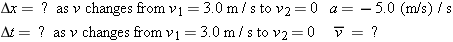 Brief Solution 1 (reasoning from fundamentals)Choice of approach. Knowing both values of v, we can (1) find v and (2) find Δv. Knowing Δv, we can use the definition of acceleration to find Δt. Then, knowing v and Δt, we can use the definition of average velocity to find Δx. What we know/what we don't.
