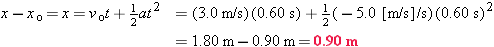 The hand in Figure 2-13a gives the cart an initial downhill shove. The cart leaves the hand with a speed of 3.0 m/s. While traveling downhill, it loses speed at a rate of 5 (m/s)/s. How far down the ramp does it go before coming back up?